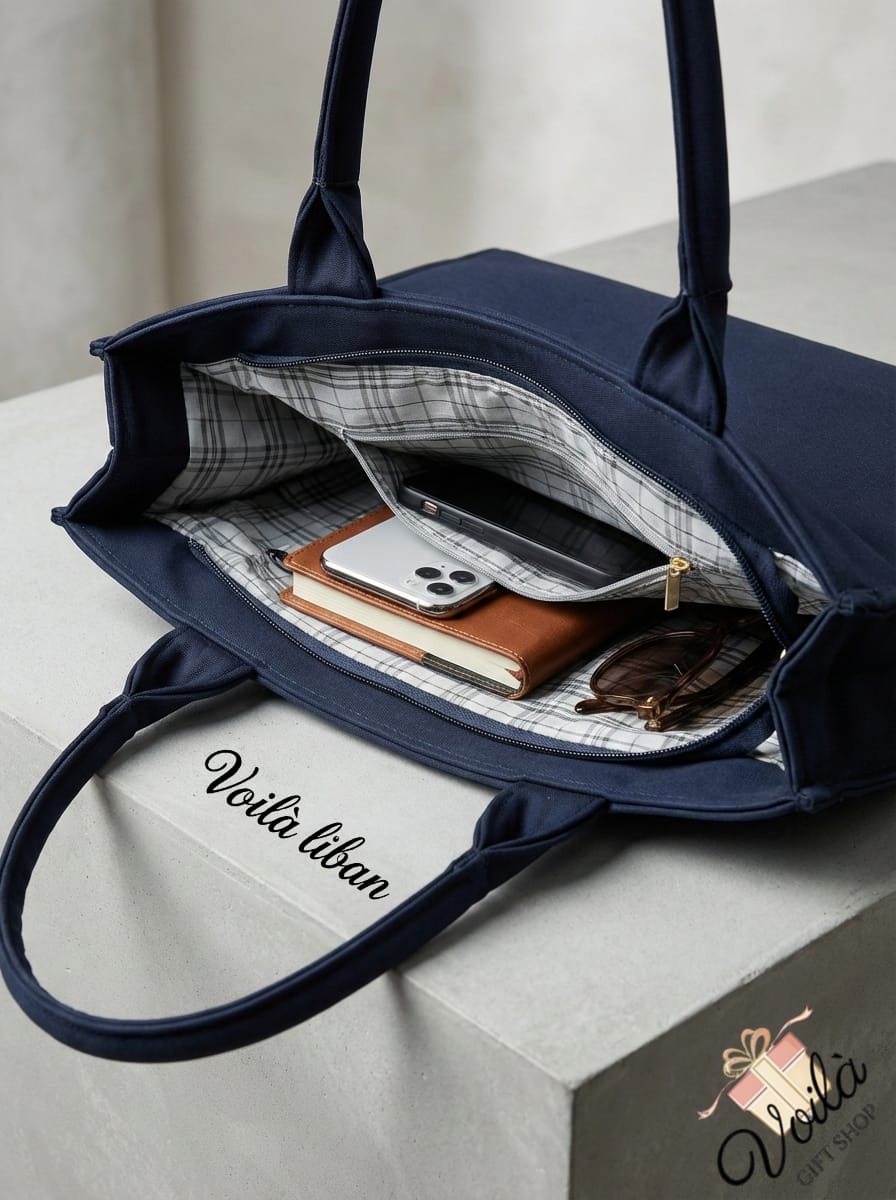 ✅ تصميم أنيق مستوحى من جواز السفر: قماش أزرق داكن فاخر مع تطريز ذهبي دقيق يحاكي غلاف جواز السفر اللبناني الرسمي. ✅ تصميم داخلي ذكي ومنظم: مبطن بالكامل بقماش رمادي أنيق بنقشة مربعات، ويحتوي على جيب آمن بسحاب وفتحات مخصصة لهاتفك وأغراضك الأساسية. ✅ مثالي للسفر: واسع بما يكفي لحمل جهاز كمبيوتر محمول مقاس 13 بوصة، ودفاتر ملاحظات، ووثائق سفر بكل راحة. ✅ إغلاق آمن: سحاب علوي ناعم وعالي الجودة يحافظ على أغراضك الثمينة آمنة أثناء تنقلك. ✅ تصميم متعدد الاستخدامات: مصمم بقاعدة متينة ومقابض قوية، مما يجعله مثاليًا للعمل أو الدراسة أو السفر الدولي.